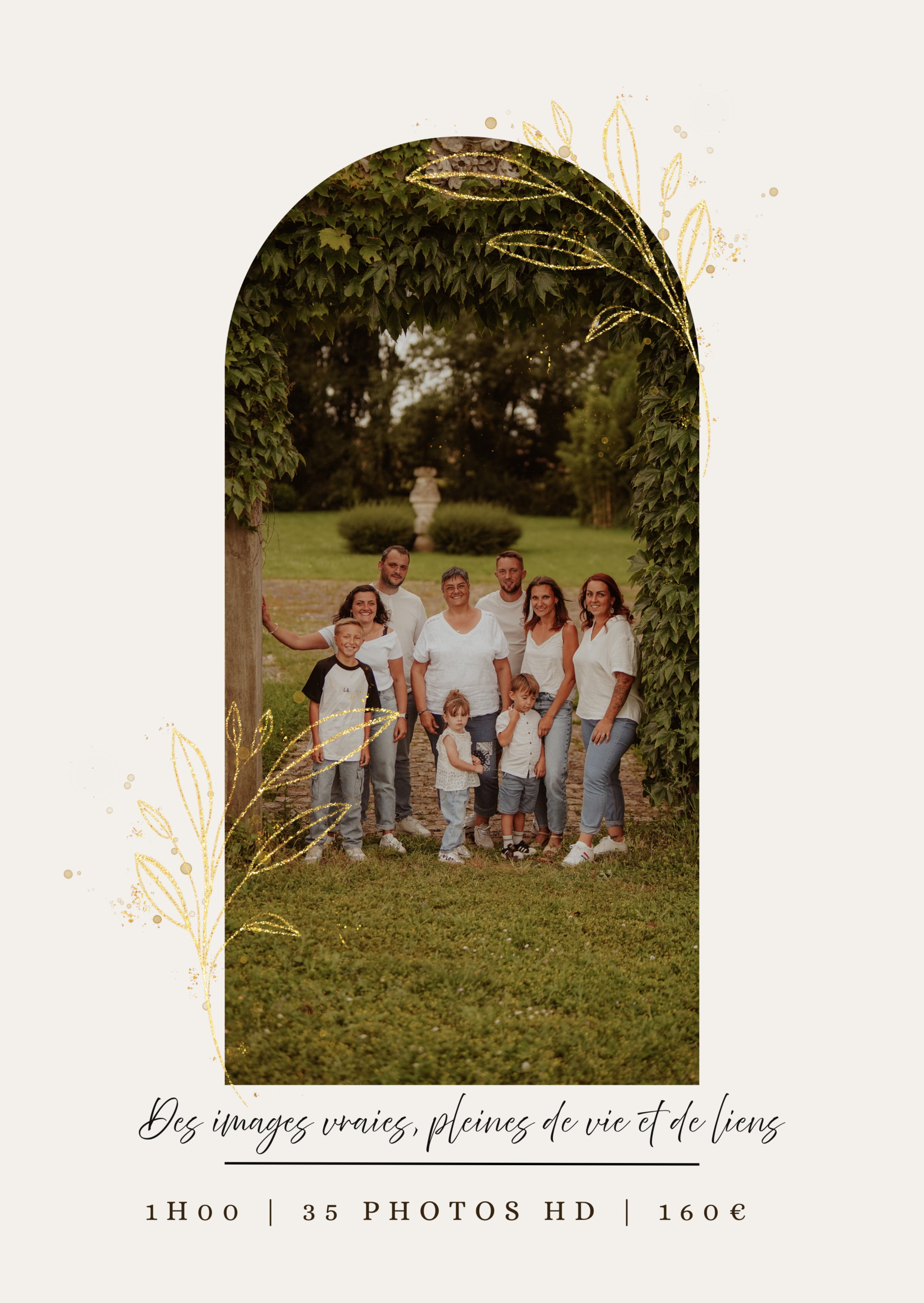 La séance famille comprend jusqu’à 6 adultes, un supplément de 10€/personne sera demandé au-delà.